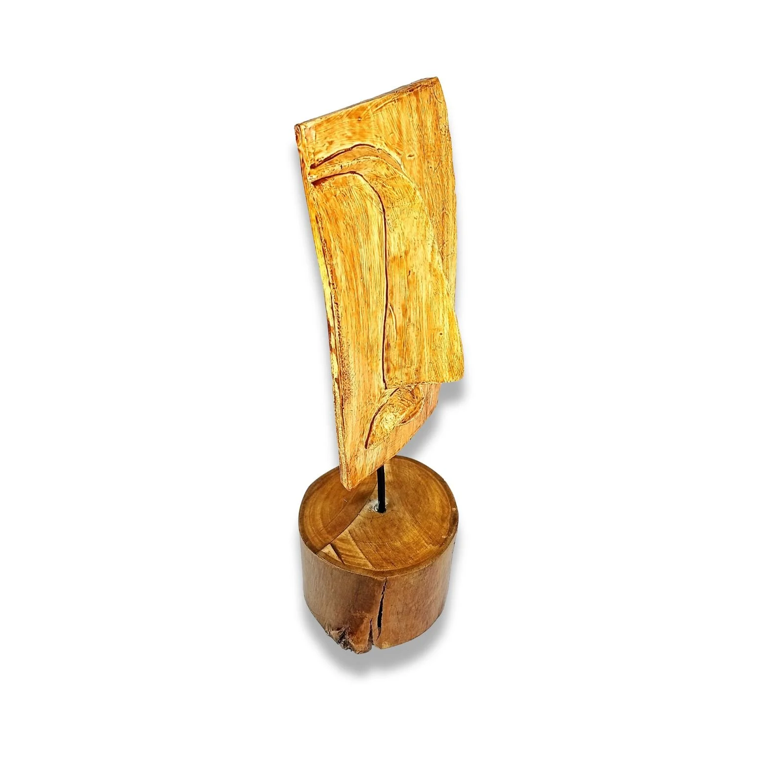 The sculpture 'Mrs Woody' is the counterpart to the 'Mr Woody' artwork, continuing the exploration of minimalist abstract figurativism. Created with the same materials and technique, this piece presents a soft, stylized figure with delicate facial features that merge with the surface texture. The natural wood base highlights the nobility of the material, while the elegant and pensive form complements its male counterpart. Together, the two sculptures form a dialogue about form and presence. A creation from 2025 that has already found its home, now residing in a private collection.