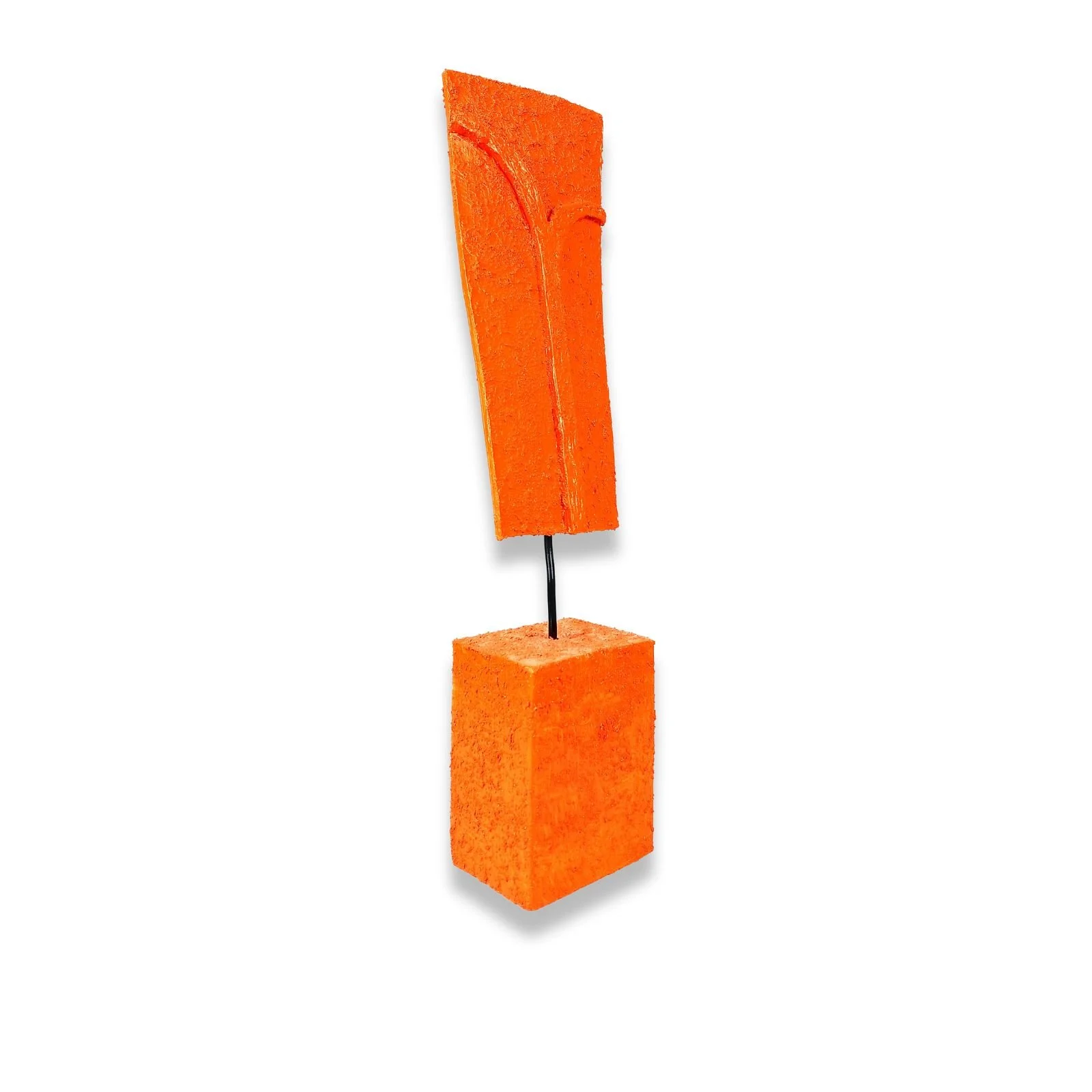 The sculpture 'Orange' is a work of Abstract Minimalist Figurativism that explores geometry and color. Created with wood, wire, and acrylics, this piece features two solid forms joined by a central axis. The upper shape, with its 'Y'-shaped incision, gives it a unique personality, while the vibrant orange color infuses the work with energy and vitality. Visual tension and balance are the foundation of this sculpture, which suggests the human form in a minimalist and stylized manner. A creation from 2025 that has already found its home, now residing in a private collection.