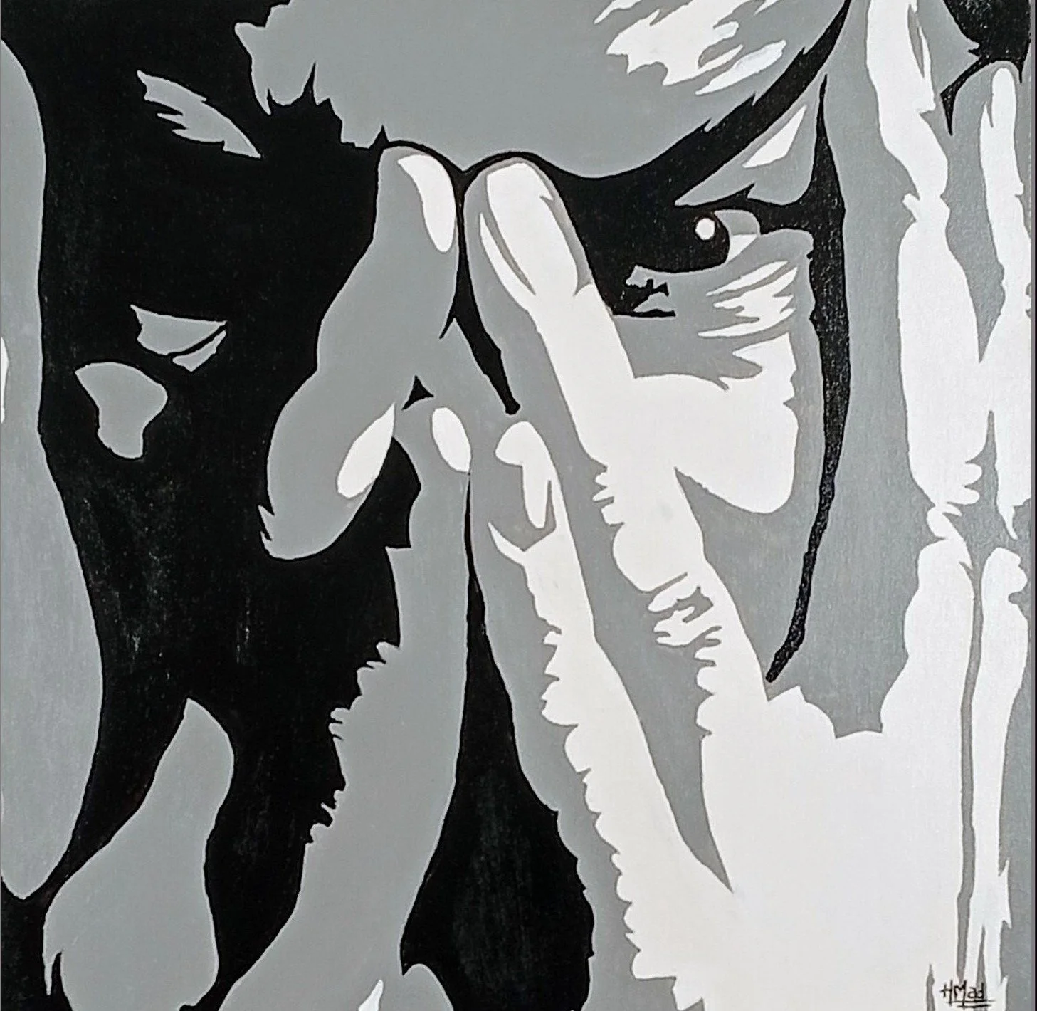 In the painting "The Awful Shame," HMad explores vulnerability and introspection through a high-impact abstract figurativism. The work, painted with acrylics and varnish, uses a monochromatic palette of blacks, whites, and grays to intensify the emotion. The figure, with its face partially covered by hands, evokes a profound sense of shame, inviting the viewer to confront complex feelings. A creation from 2022 that has already found its home, now residing in a private collection.