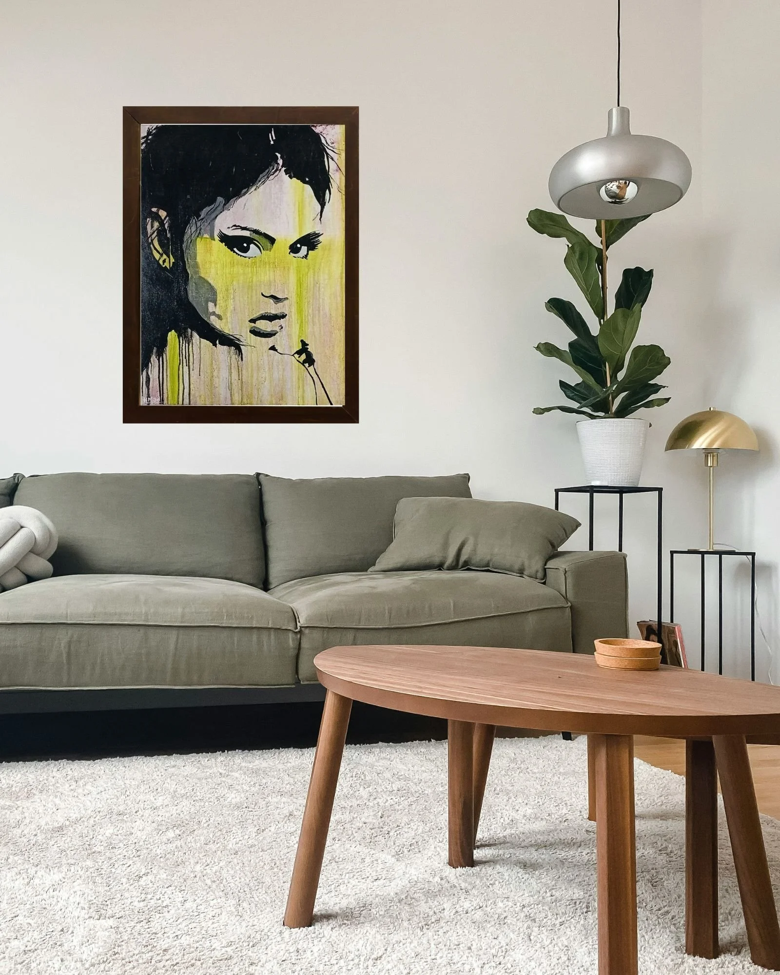 In the painting "Seducing," HMad captures the essence of mystery and seduction through abstract figurativism. The work, painted with acrylics on varnished canvas, uses vibrant yellow tones and flowing brushstrokes that merge with the figure. The woman's direct and intense gaze, accentuated by a strong and expressive line, dominates the composition, inviting the viewer into an intriguing and captivating interaction. A creation from 2022 that has already found its home, now residing in a private collection.