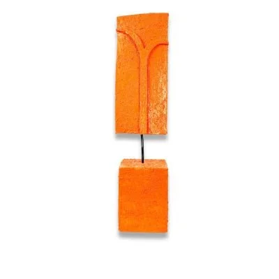A escultura "Orange" é uma obra de Figurativismo Abstrato Minimalista que explora a geometria e a cor. Criada com madeira, arame e acrílicos, esta peça apresenta duas formas sólidas unidas por um eixo central. A forma superior, com a sua incisão em "Y", confere-lhe uma personalidade única, enquanto a cor laranja vibrante infunde a obra de energia e vitalidade. A tensão e o equilíbrio visual são a base desta escultura que sugere a forma humana de maneira minimalista e estilizada. Uma criação de 2025 que já encontrou o seu lar, residindo agora numa coleção privada.