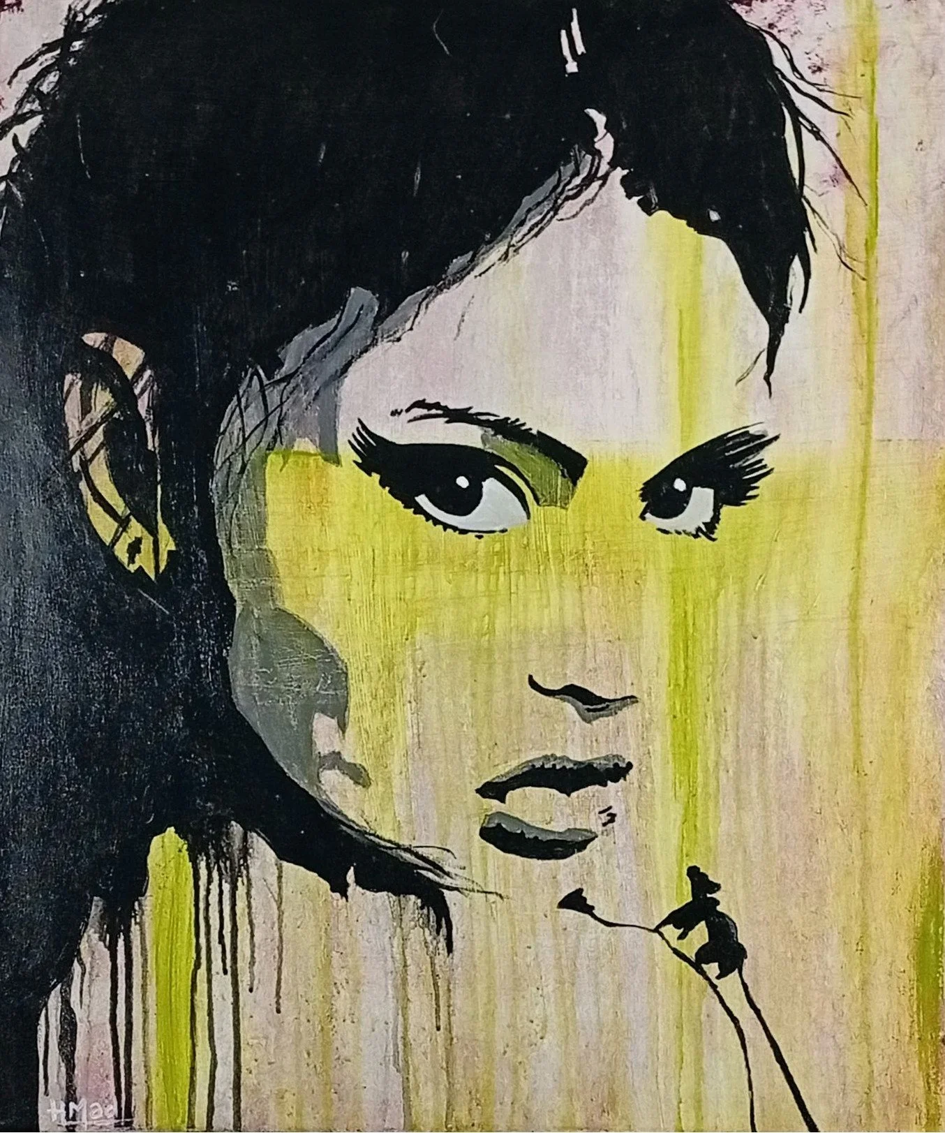 Na tela "Seducing", HMad capta a essência da sedução e do mistério através de um figurativismo abstrato. A obra, pintada com acrílicos sobre tela envernizada, utiliza tons vibrantes de amarelo e pinceladas fluidas que se fundem com a figura. O olhar direto e intenso da mulher, acentuado por um traço forte e expressivo, domina a composição, convidando o observador a uma interação intrigante e envolvente. Uma criação de 2022 que já encontrou o seu lar, residindo agora numa coleção privada.